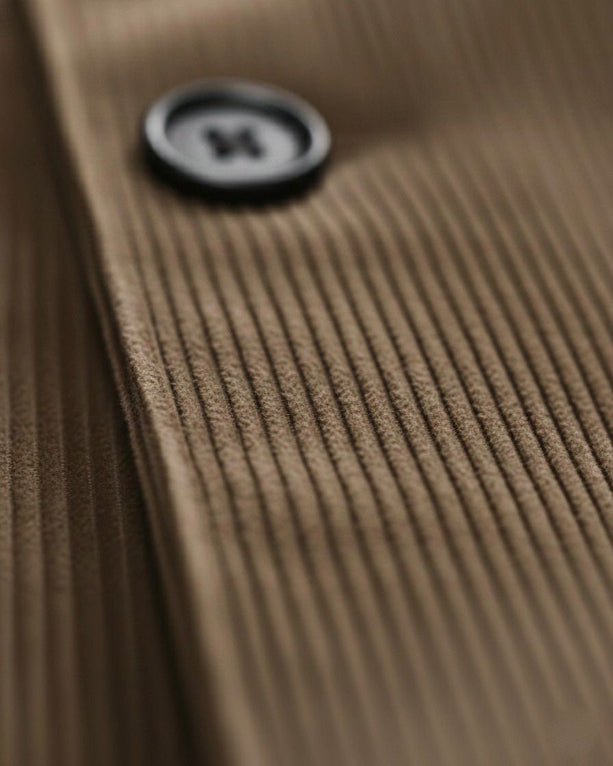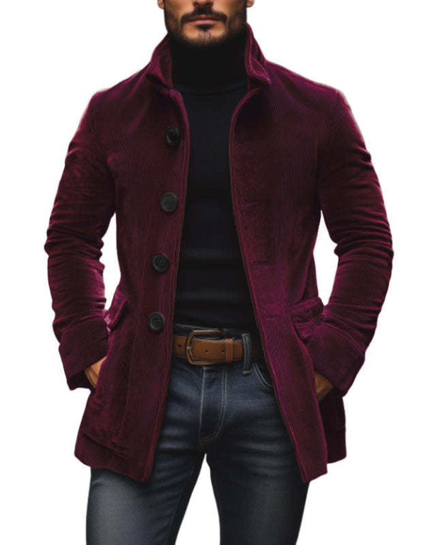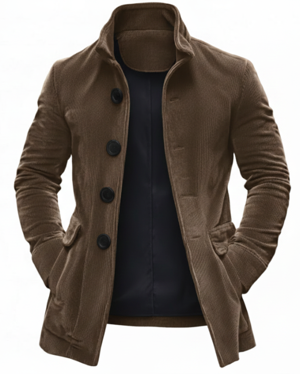This stylish ribbed coat effortlessly combines elegance and comfort. With its slim fit and distinctive stand collar, it creates a modern, refined look that conveys confidence and authority. The soft ribbed texture feels warm and durable without being heavy. Perfect for chilly winter days when you want to blend European style with everyday practicality. The contrasting brown buttons add a premium touch to the deep black design.